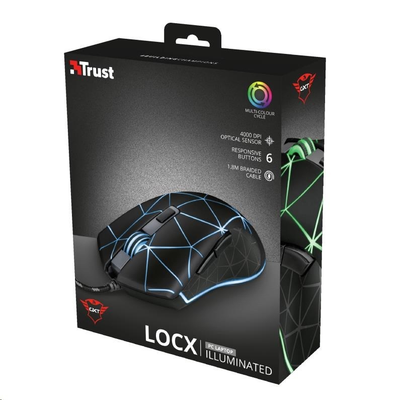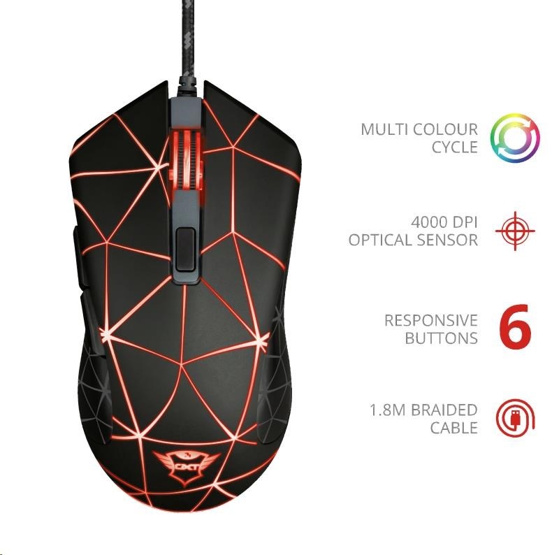 TRUST GXT 133 Locx Gaming MouseRozhraní myši:Drátová USB; Druh myši:Optická; Specifikace myši:4 a více tlačítek.