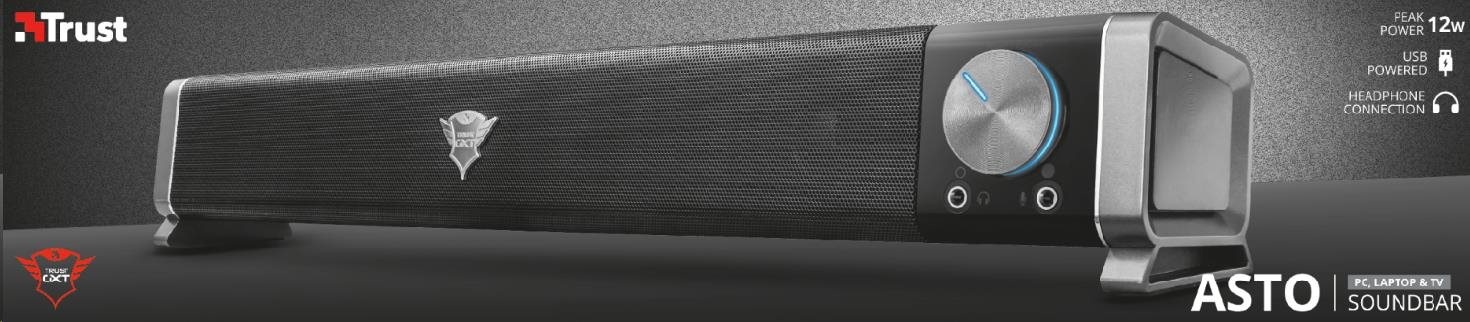 TRUST Reproduktory Asto Sound Bar PC SpeakerSpecifikace sestavy:Soundbar; Výkon sestavy RMS (ve W):6; Vybavení reproduktorů:Integrovaný zesilovač; Rozhraní:USB, 3.5mm jack.