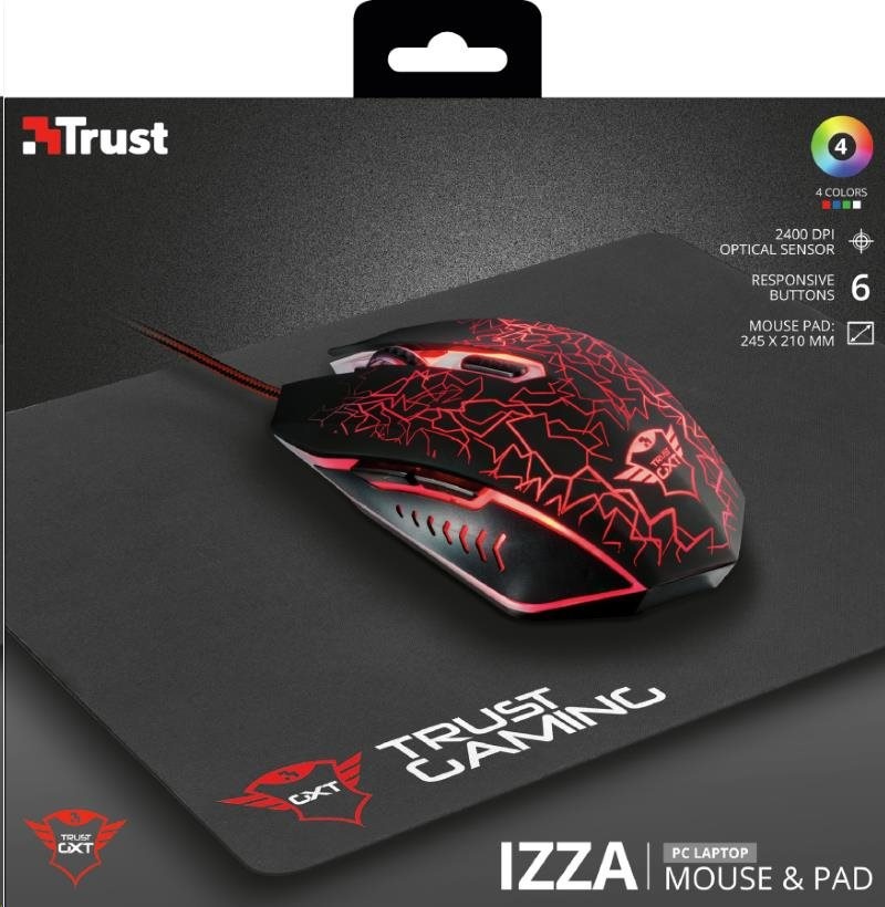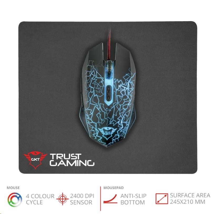 TRUST herní Myš s podložkou GXT 781 Rixa Camo Gaming Mouse & Mouse PadRozhraní myši:Drátová USB; Druh myši:Optická; Specifikace myši:4 a více tlačítek, S kolečkem.
