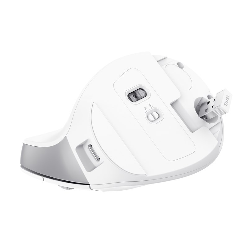 TRUST myš Bayo II Ergonomická vertikální myš, Bezdrátová, bíláRozhraní myši:Bezdrátová Bluetooth, Bezdrátová s USB dongle; Druh myši:Optická; Specifikace myši:4 a více tlačítek, S kolečkem.