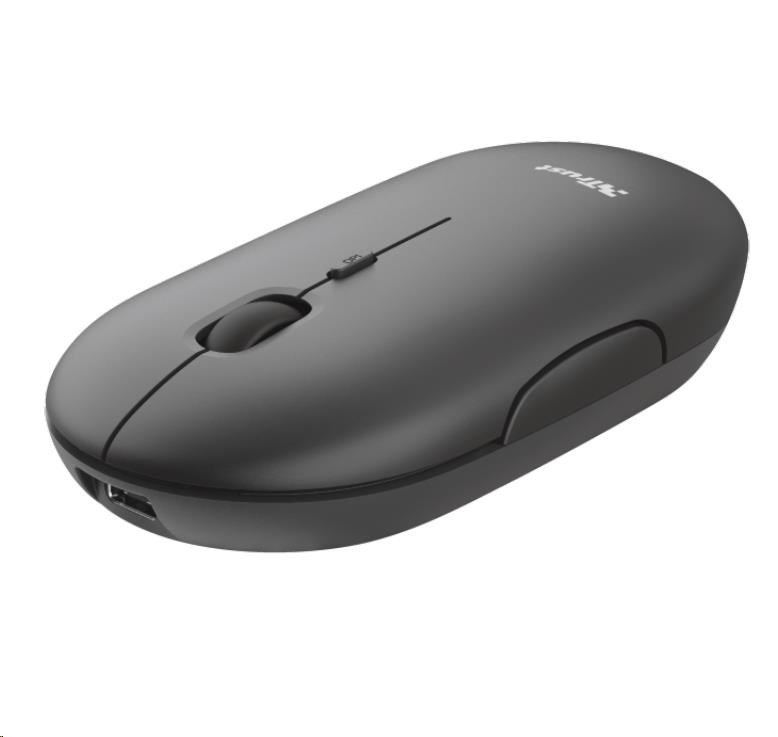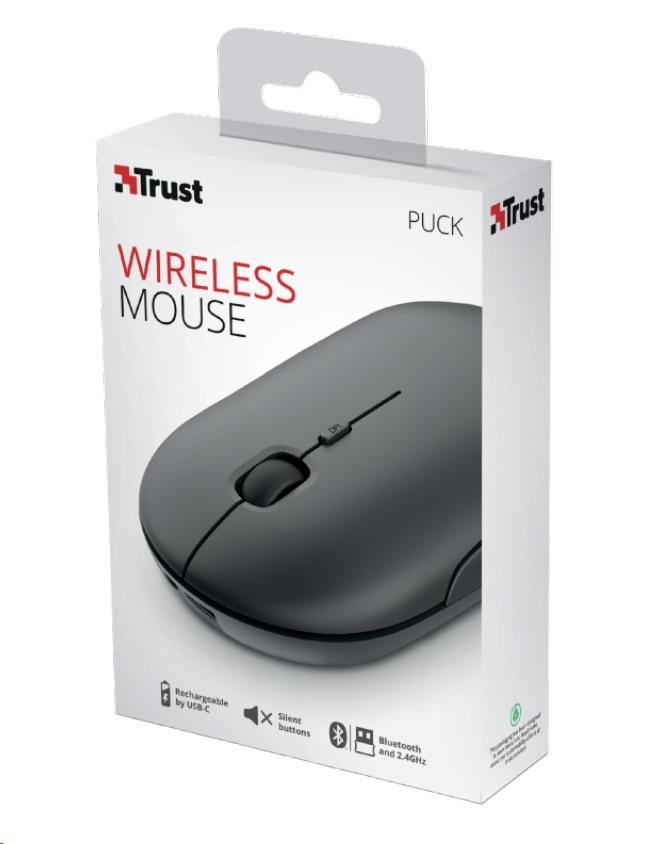 TRUST myš PUCK, bezdrátová, USB, černáRozhraní myši:Bezdrátová Bluetooth, Bezdrátová s USB dongle; Druh myši:Optická; Specifikace myši:4 a více tlačítek, S kolečkem.
