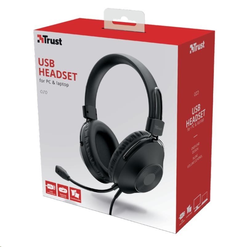TRUST sluchátka s mikrofonem Ozo Over-Ear USB HeadsetTyp sluchátek:Plná; Rozhraní sluchátek:USB; Vlastnosti sluchátek:S mikrofonem, Ovládání hlasitosti.