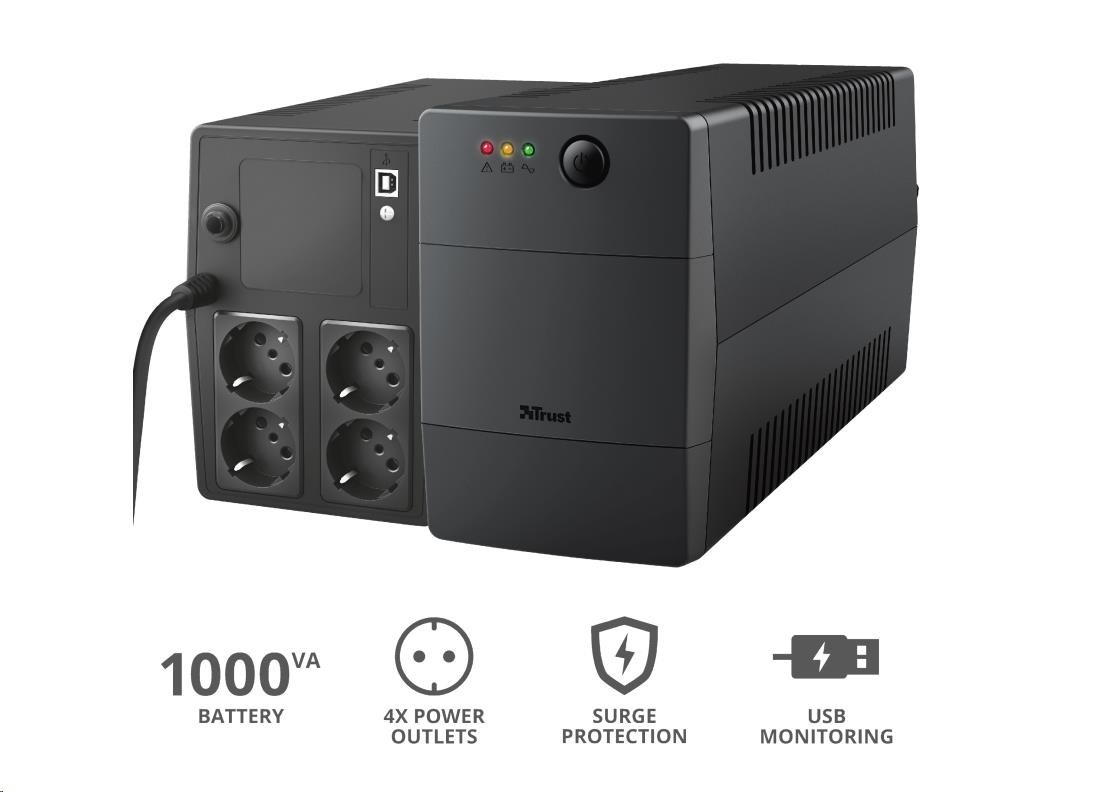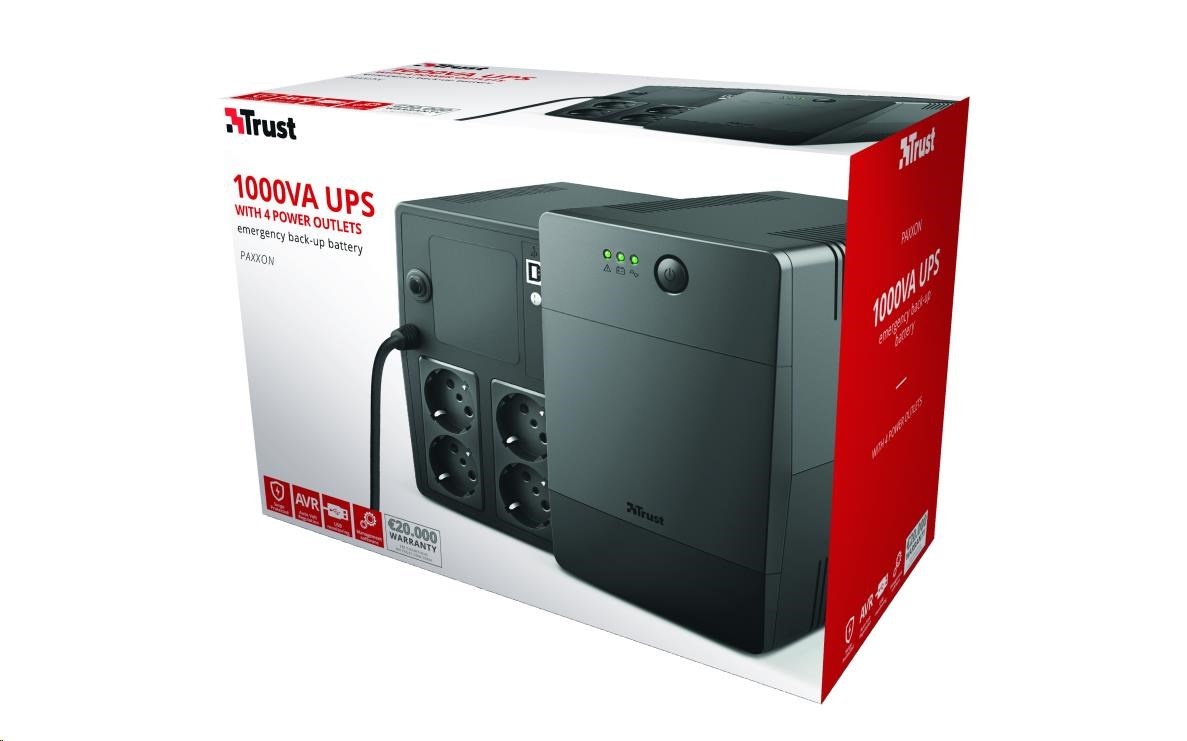 TRUST UPS Paxxon 1000VA UPS with 4 standard wall power outletsPočet výstupních zásuvek:4; Použití:Desktop; Provedení:Tower; Zdánlivý výkon VA:1000; Fáze (Vstup/Výstup):1:1; Komunikace:USB; Typ výstupu:FR, SCHUKO.