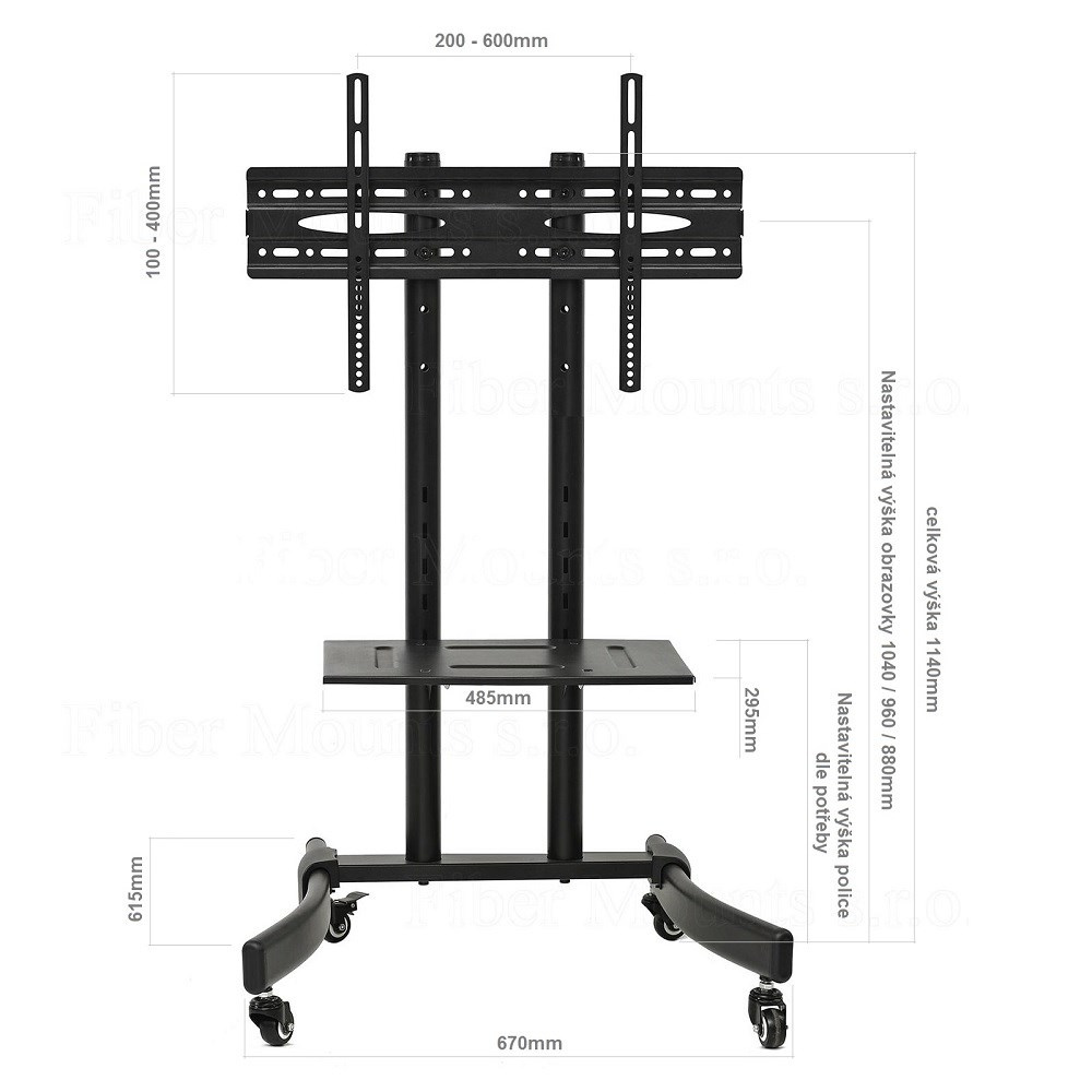 Tv stojan Fiber Mounts M7C39Podlahový pojízdný stojan na televize 32" až 65", nastavitelná výška televize 89/96/114cm, polička 485x295mm, pojízdný, VESA 200x100 až 600x400, nosnost 40kg.