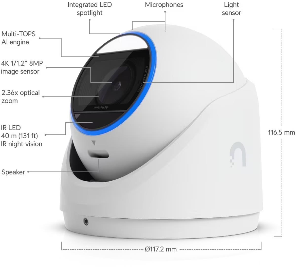 UBNT G6 Pro Turret, UniFi 8MP IP kamera, bíláRozlišení (MPx):4; Ohnisková vzdálenost (mm):4; IR/LED přísvit (m):10; IR/LED přísvit (m):10.