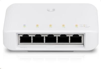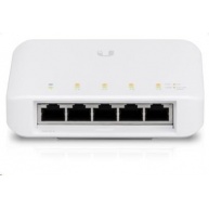 USW-FLEX je 5-portový venkovní Gigabitový switch s možností PoE-In a PoE-Out na 4 portech. Switch umožňuje na výstupních portech aktivní napájení typu 802.3af, což dává celkově 15.4W na každém portu.