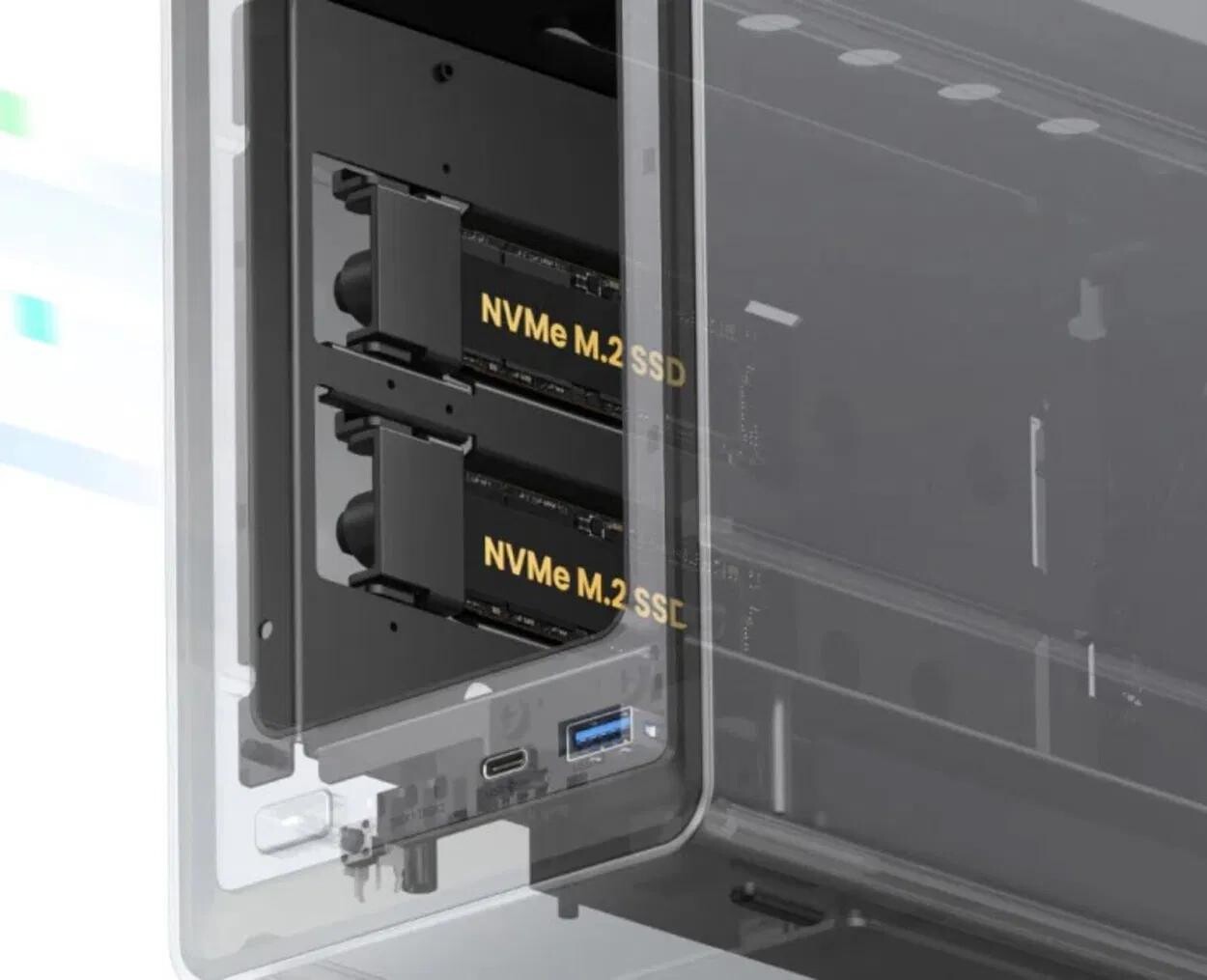 - UGREEN NAS DXP6800 Pro obsahuje 2 NVMe M.2 sloty pro extrémně rychlé SSD disky
