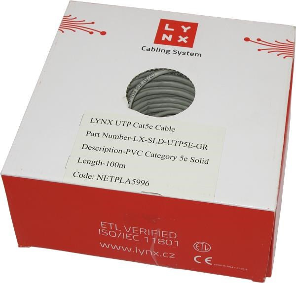 UTP kabel LYNX, Cat5E, drát, PVC, Dca, šedý, 100mTyp komponenty:Kabel horizontální; Provedení:Cat5E; Stínění:UTP.
