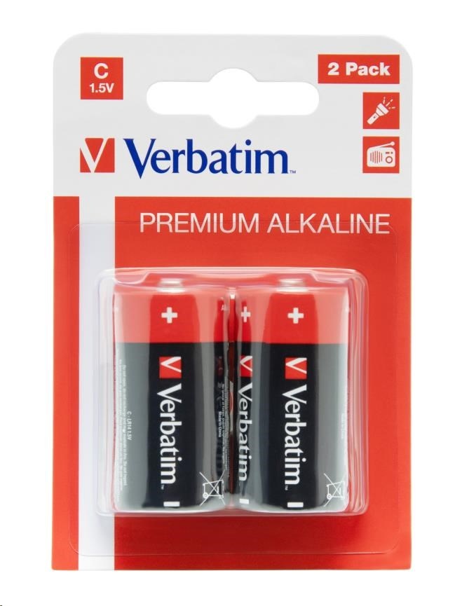 VERBATIM Alkalické baterie C, 2 PACK / LR14Produkt:Baterie; Typ baterie:Jednorázová; Velikost článku:Ostatní; Napětí (V):1,5; Typ článku:Alkalický; Obsah balení:2.