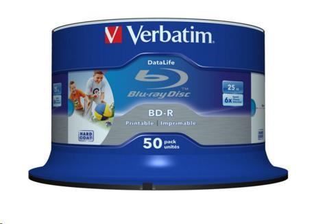 VERBATIM BD-R SL Datalife (50-pack)Blu-Ray/Spindle/6x/25GB WHITE BLUE SURFACETyp média:Bluray BR-R; Druh balení média:Spindle; Vlastnosti média:Potisknutelné.