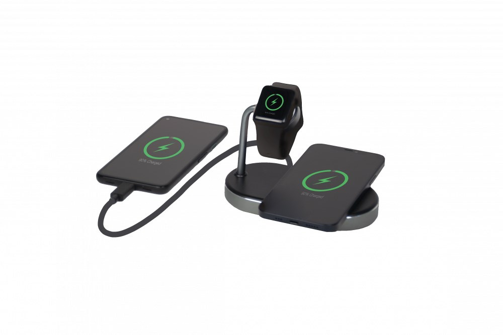Nabíjejte bezdrátově své Apple Watch, iPhone (8 nebo novější) nebo jiné zařízení s certifikací Qi pro bezdrátové nabíjení a třetí zařízení kabelem přes port Quick Charge 3.0 USB-A.
