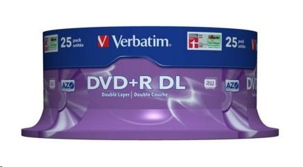 VERBATIM DVD+R(25-pack) Double layer/8x/8.5GB/spindleTyp média:DVD+R; Druh balení média:Spindle; Vlastnosti média:Dvouvrstvé.