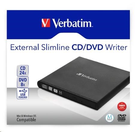 Externí CD/DVD vypalovačka Verbatim Slimline podporuje formáty CD-R, CD-RW, DVD±R, DVD±R DL, DVD±RW, DVD-ROM. Rychlost zápisu je u CD-R 24 x a u DVD-R 8 x. Plně odpovídá standardům archivační technologie MDISC™ a je vybavena rozhraním USB 2.0.