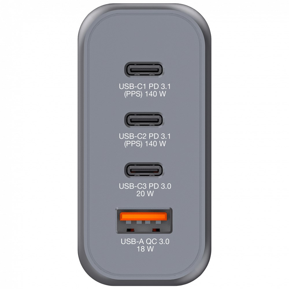 Verbatim GaN nabíječka do sítě o výkonu 140 W v designu, který se vejde do dlaně, kombinuje dva porty USB-C PD 140 W, jeden port USB-C PD 20 W a jeden port USB-A QC 3.0. Ideální do kanceláře, pro domácí použití nebo na cesty, kde dodá energii vašemu notebooku, tabletu, chytrému telefonu, herním a mnoha dalším zařízením.