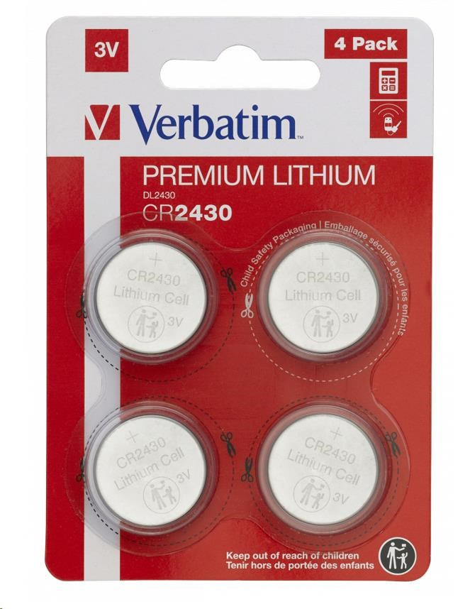 VERBATIM Lithium baterie CR2430 3V 4 PackProdukt:Baterie; Typ baterie:Jednorázová; Velikost článku:Knoflíková; Napětí (V):3; Typ článku:Lithiový; Obsah balení:4.
