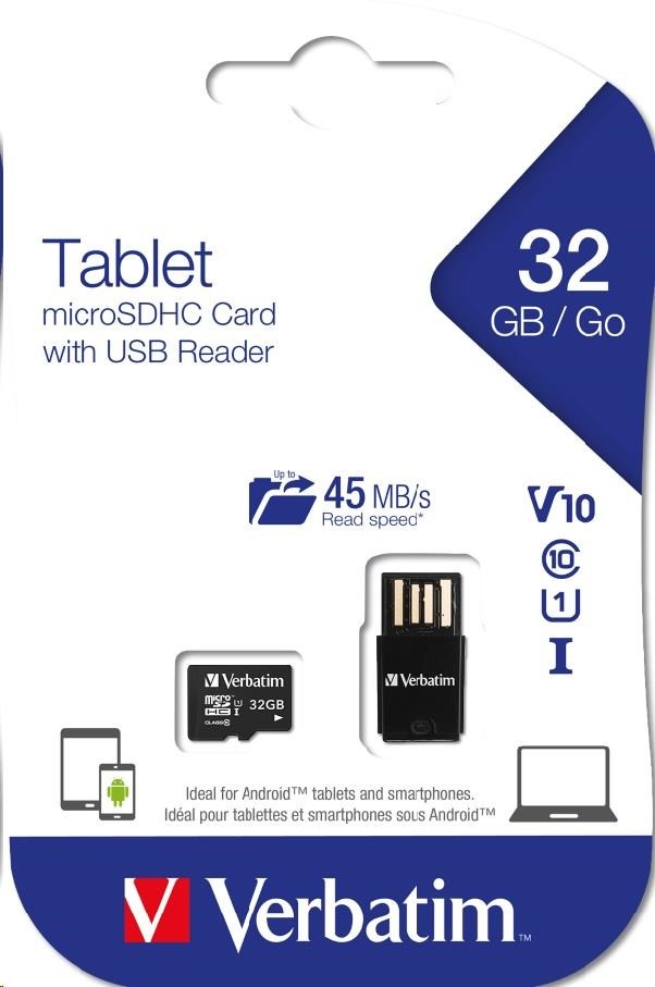 VERBATIM Tablet microSDHC C10/U1 with USB reader 32GB (R:45MB/s, W:10MB/s)Typ karty:Micro SDHC; Kapacita uložiště:32 GB.