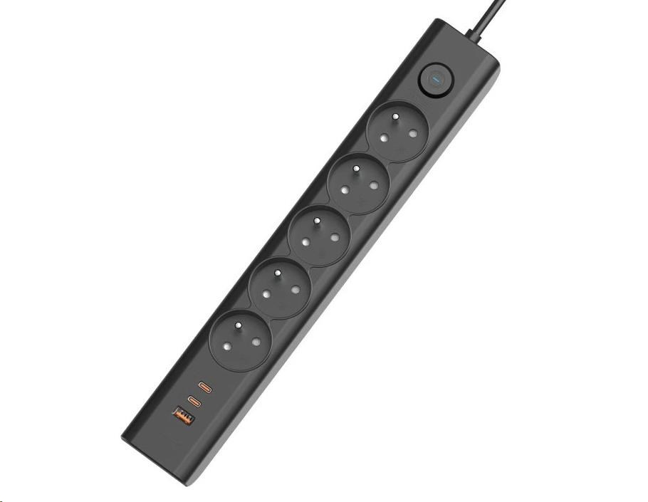 Viking síťová prodlužovací zásuvka YC53, 5x AC 230V, 1x USB-A, 2x USB-C, délka 1,5 m, černá
