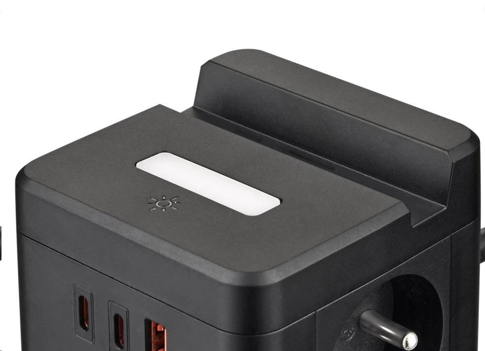 Viking síťový adaptér YC23H, 2x 230 V, 1x USB-A, 2x USB-C, dotykové světlo, funkce stojánku, černáTyp elektroniky:Spínače a zásuvky.