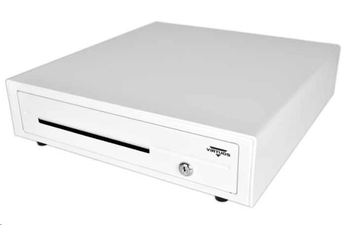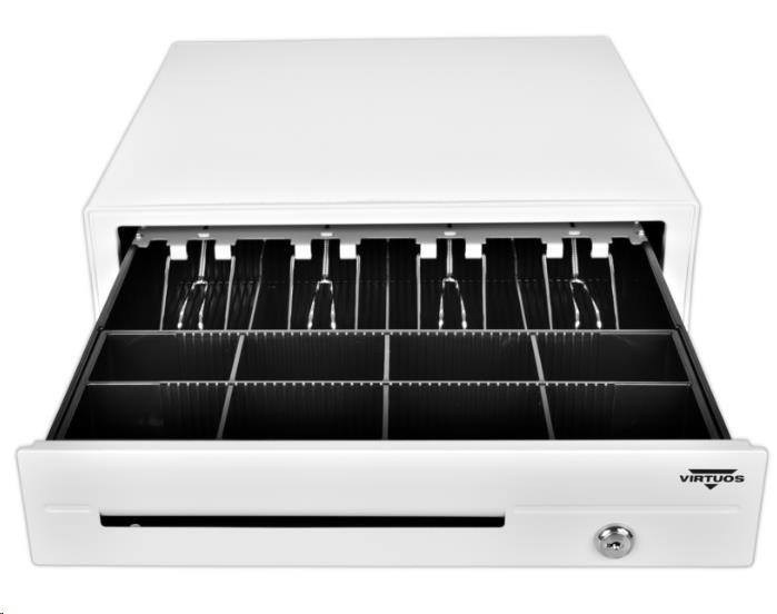 Virtuos pokladní zásuvka C420D - s kabelem, kovové držáky, 9-24V, bíláDruh otevírání:Přední; Konektivita:RJ12.