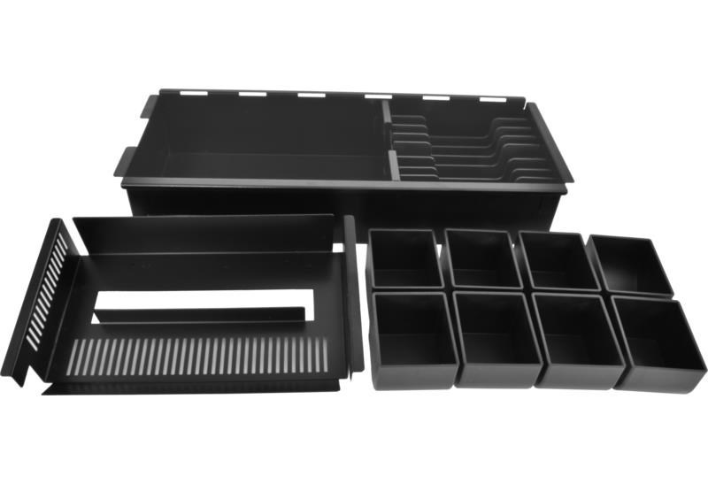 - Vyjímatelný kovový pořadač s nastavitelnými plastovými oddělovači přihrádek pro bankovky