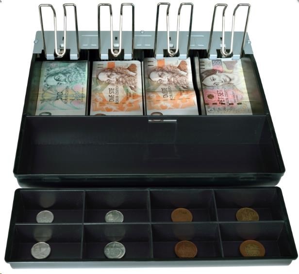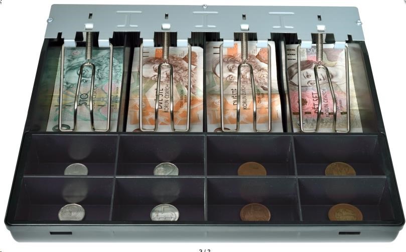 •Přihrádky: 8 × pro mince 4 × pro bankovky - vzhledem k velikosti pořadače se bankovky větší velikosti (vyšší hodnoty od 1000 Kč) umísťují pod mincovník