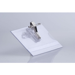 Tuhá, čirá visačka z PVC o rozměru 60×90 mm, s pojistným špendlíkem a svorkou „krokodýl“. Uvnitř s papírem 58×88 mm. Tloušťka PVC 0,3 mm zajišťuje tvarovou stálost..