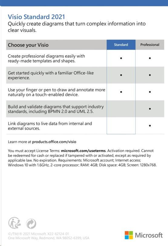 Visio Standard 2021 CZPro koho je licence určena:Komerční; Jazyk:Český; Způsob licencování:Plná verze; Typ licence:Krabice; Produktová řada:Office Standard.