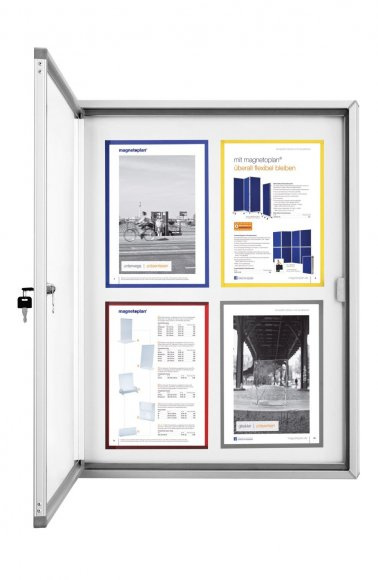 Vitrína Magnetoplan pro venkovní prostory. Vnitřní čelní stěna bílá magnetická, popisovatelná – velikostně optimální pro umístění 6× A4 formátu. Prosklená dvířka – bezpečnostní sklo, zámek s dvěma klíči, zadní stěna kovová pozinkovaná. Po obvodu elegantní hliníkový profil s gumovým těsněním na obvodu dvířek. Dodáváno s montážním materiálem. Rozměry: Venkovní (š x v x h): 900×790×65 mm Vnitřní bílá plocha (š x v): 790×680 mm Vniřní/celková hloubka: 20/65 mm.