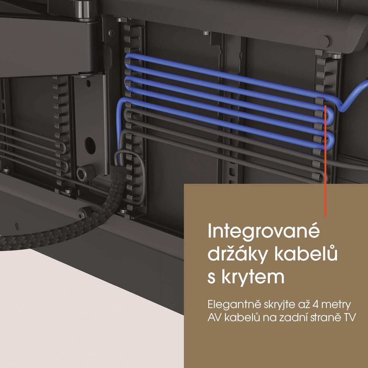 Pokud se snažíte o čistý a minimalistický design, nechcete mít žádné kabely na očích. Proto je TVM 7655 vybaven systémem uložení kabelů (CIS®). Tento systém vede kabely od stěny k televizoru skrz nosná ramena. Díky integrovaným držákům kabelů s krycí lištou můžete tak elegantně skrýt téměř 4 metry kabelů na zadní straně televizoru. Nechat kabely zmizet ve zdi je snadné díky otvoru v nástěnné desce TV držáku.