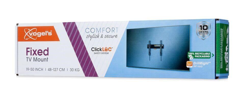 Instalace nástěnného držáku COMFORT Fixed je snadná. Vše je srozumitelně vysvětleno v přiloženém stručném návodu k instalaci. Můžete si také online prohlédnout podrobný návod nebo instalační video. Součástí balení je vrtací šablona, šrouby a hmoždinky Fischer® DuoPower a samotný nástěnný držák má zabudovanou vodováhu. Pomocí naší bezplatné aplikace DrillRight™ AR App si můžete díky rozšířené realitě snadno prohlédnout, jak bude vypadat váš televizor v konkrétním interiéru a vyznačit na stěně přesnou polohu pro první vrtací otvor. Poté přiložíte vrtací šablonu a vyznačíte si zbývající otvory pro montáž držáku.