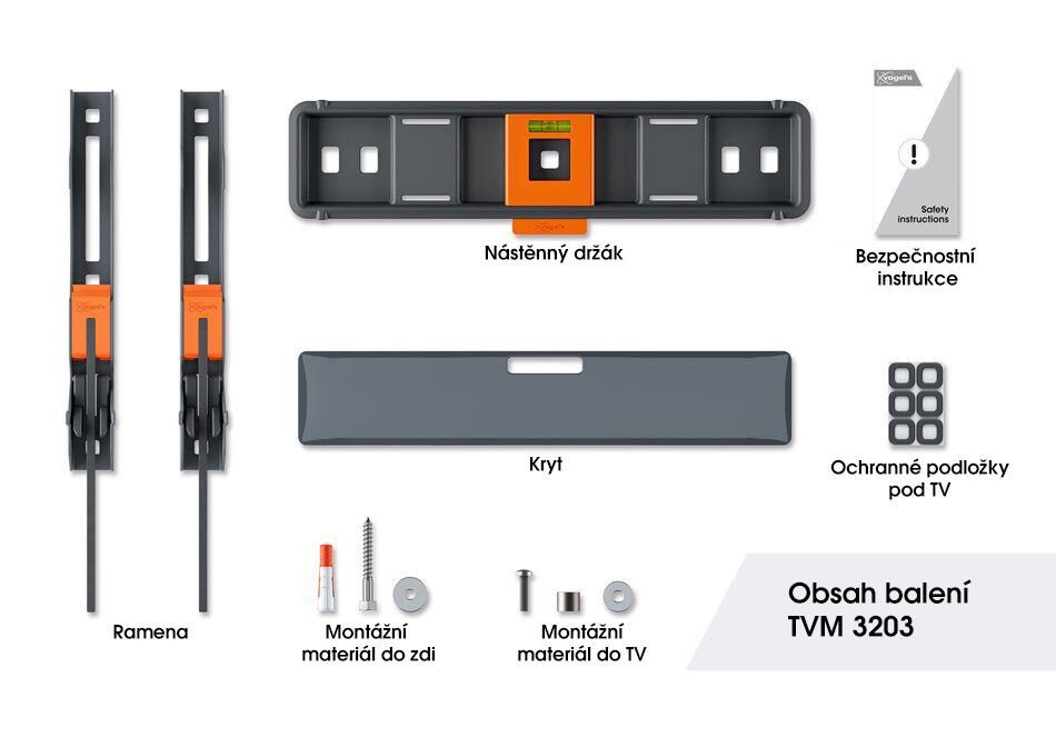 Tento nástěnný držák televizoru z řady COMFORT Fixed je ideálním řešením, pokud chcete televizor bezpečně a stylově připevnit na zeď. Nástěnný TV držák je vhodný pro televizory s úhlopříčkou od 19 do 50 palců a hmotností do 30 kg. Mezi televizorem a stěnou je vzdálenost pouhých 2,2 cm. Nástěnný držák televizoru TVM 3203 je pevný držák, který nelze otáčet ani naklápět. Ideální volba, pokud sedíte přímo před televizorem.