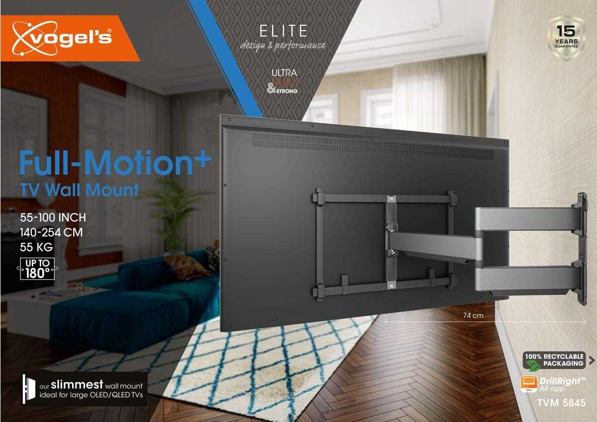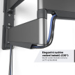 Nástěnný držák ELITE Forward Motion TV je speciální, mimořádně pevný nástěnný držák vhodný pro televizory s úhlopříčkou 55 až 100 palců a hmotností až 75 kg - ideální pro velké televizory OLED nebo QLED. ELITE Forward Motion se otáčí až o 120°, takže můžete televizor sledovat prakticky v jakémkoli úhlu. Držák na stěnu je nejen velmi pevný, ale také velmi tenký, takže mezi televizorem a stěnou zůstává pouze 4,5 cm.