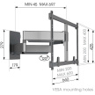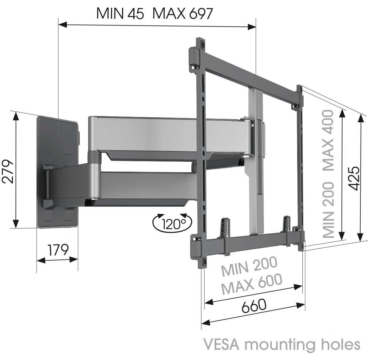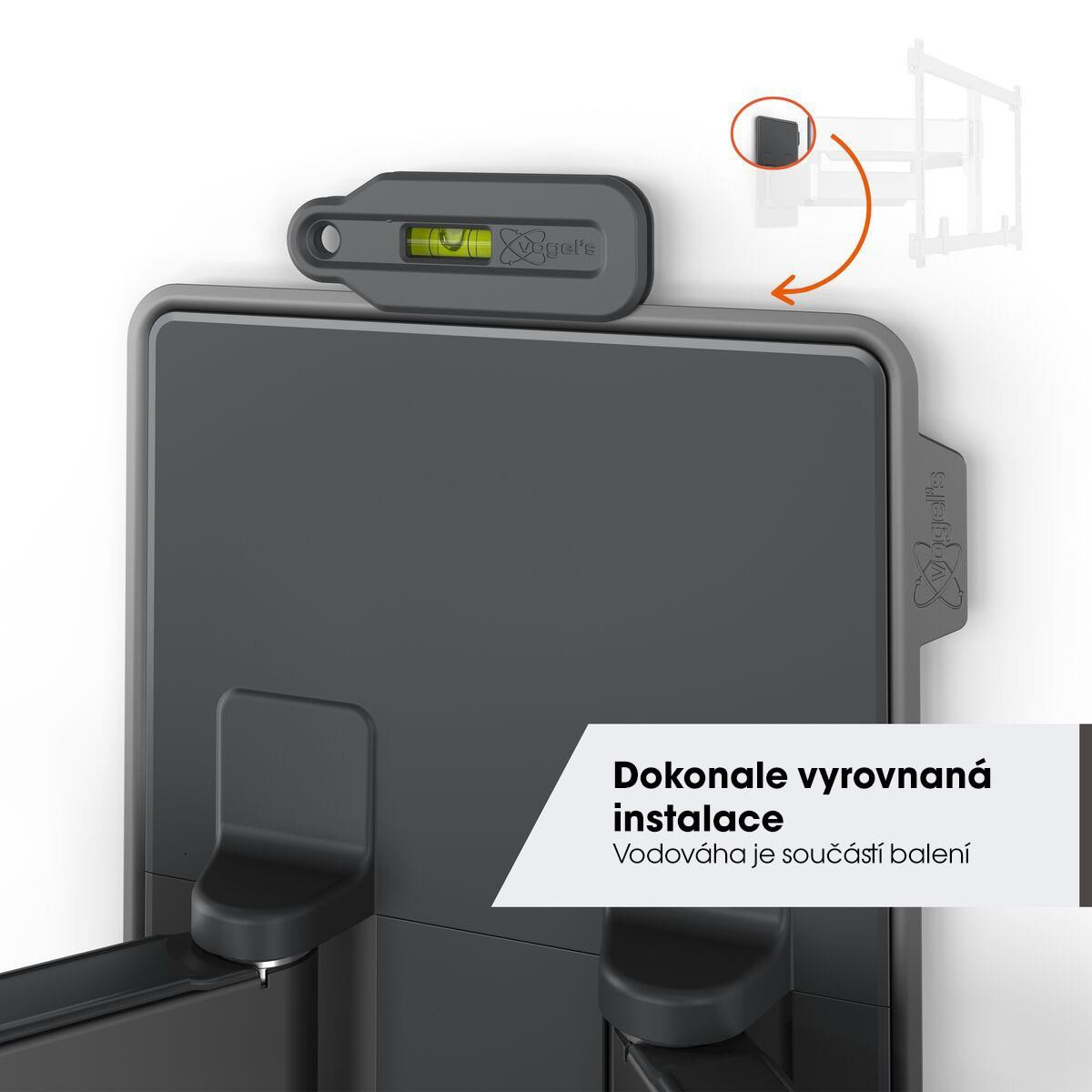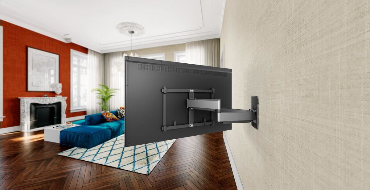 Díky 69 cm dlouhým ramenům má držák velký dosah dopředu, takže je ideální pro montáž do skříně nebo niky. Funkce naklápění byla záměrně vynechána kvůli ochraně velkých citlivých obrazovek. Výhodou velkých obrazovek je samozřejmě to, že pro skvělý zážitek ze sledování naklánění není nutné.