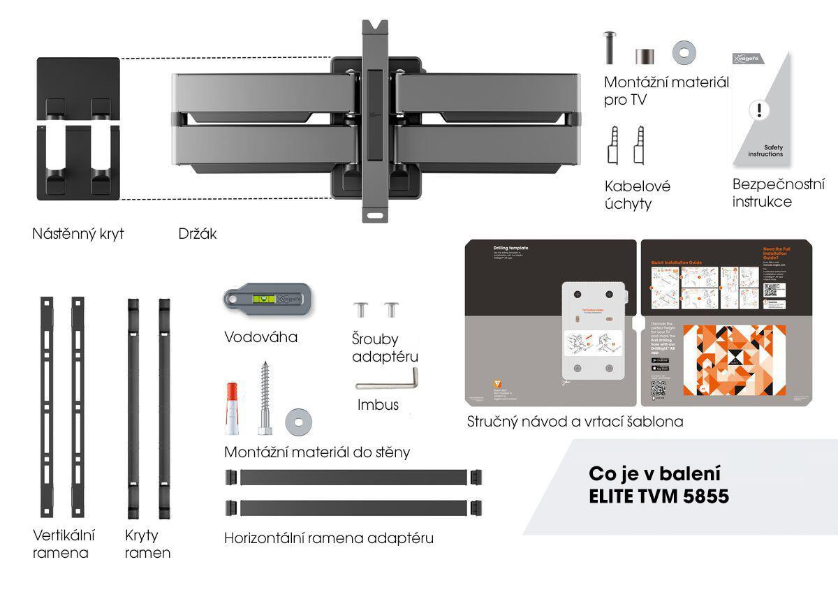 Držáky řady ELITE se snadno instalují. Součástí balení je stručný návod k instalaci a podrobný manuál a instalační video jsou k dispozici online. Součástí dodávky je veškerý potřebný instalační materiál: vodováha, vrtací šablona, extra široká nástěnná deska, šrouby a hmoždinky Fischer DuoPower®. A s naší bezplatnou aplikací DrillRight™ AR můžete snadno vyznačit na stěně první vrtací otvor. Příjemný detail: měkké ochranné krytky na nástěnném držáku zabraňují poškrábání zadní strany televizoru při instalaci.