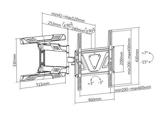 Výsuvný otočný sklopný držák Tv Fiber Mounts Super-1Nástěnný držák vynikající kvality a parametrů na Tv 32-65", otáčení +/-90°, naklápění +7° / -15°, vzdálenost od zdi 41-520mm, VESA 200x100 až 400x400, nosnost 35kg.