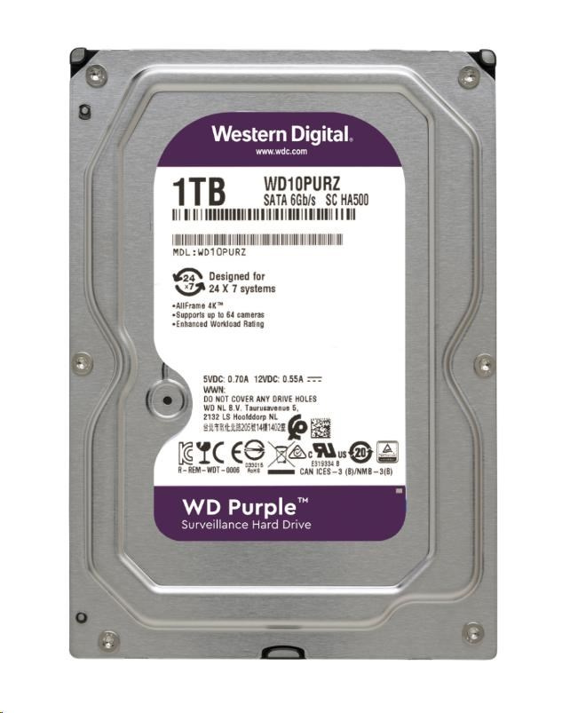WD PURPLE WD11PURZ 1TB, SATA III 3.5", 64MB 5400RPM, 110MB/s, Low Noise, CMRPoužití disku:Pro PC; Formát:3.5"; Rozhraní:interní Serial ATA III; HDD Kapacita (GB):1000; Otáčky HDD:5400; Typ disku:HDD externí; Velikost bufferu (v MB):64.