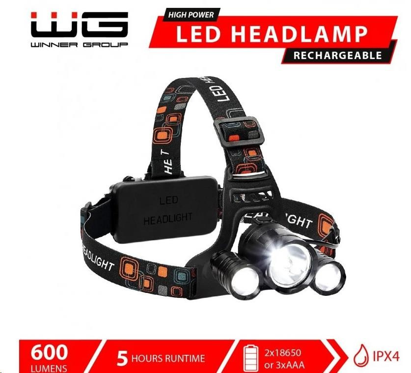 Vynikající, moderní a vysoce účinná čelovka od společnosti Winner Group bude skvělým společníkem při venkovních aktivitách. Je určena pro individuální použití ve tmě nebo v interiéru bez osvětlení. Čelovka vám skvěle poslouží při nejrůznějších dobrodružstvích jako je kempování, sportovní aktivity, noční rybolov, či prozkoumávání tajných chodeb a jeskyň. Kompaktní čelovku si můžete vzít prostě kamkoli, vejde se do batohu i kapsy. Čelovku si nasadíte na hlavu a rázem máte obě ruce volné a můžete je bez omezení používat. Díky možnosti nastavení předních světel směrem dolů až o 105° můžete upravit úhel světla podle vašich potřeb, aby světlo dopadalo přesně na požadované místo. Světlo má jas 600 lumenů a jeho dosah je 300 metrů. Výhodou této čelovky je, že si můžeme vybrat ze dvou variant napájení. Buď použijeme klasické tužkové baterie AAA, které po dosvícení vyměníme za nové, nebo můžeme použít baterie 18650, které po dosvícení dobijeme pomocí přloženého kabelu Micro USB.