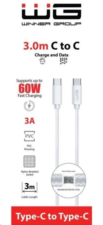 WG - Datový kabel Type-C na Type-C, 3 metry, 3A, 60W, bíláSpecifikace kabelu / redukce:USB-C; Input:USB-C; Output:USB-C.