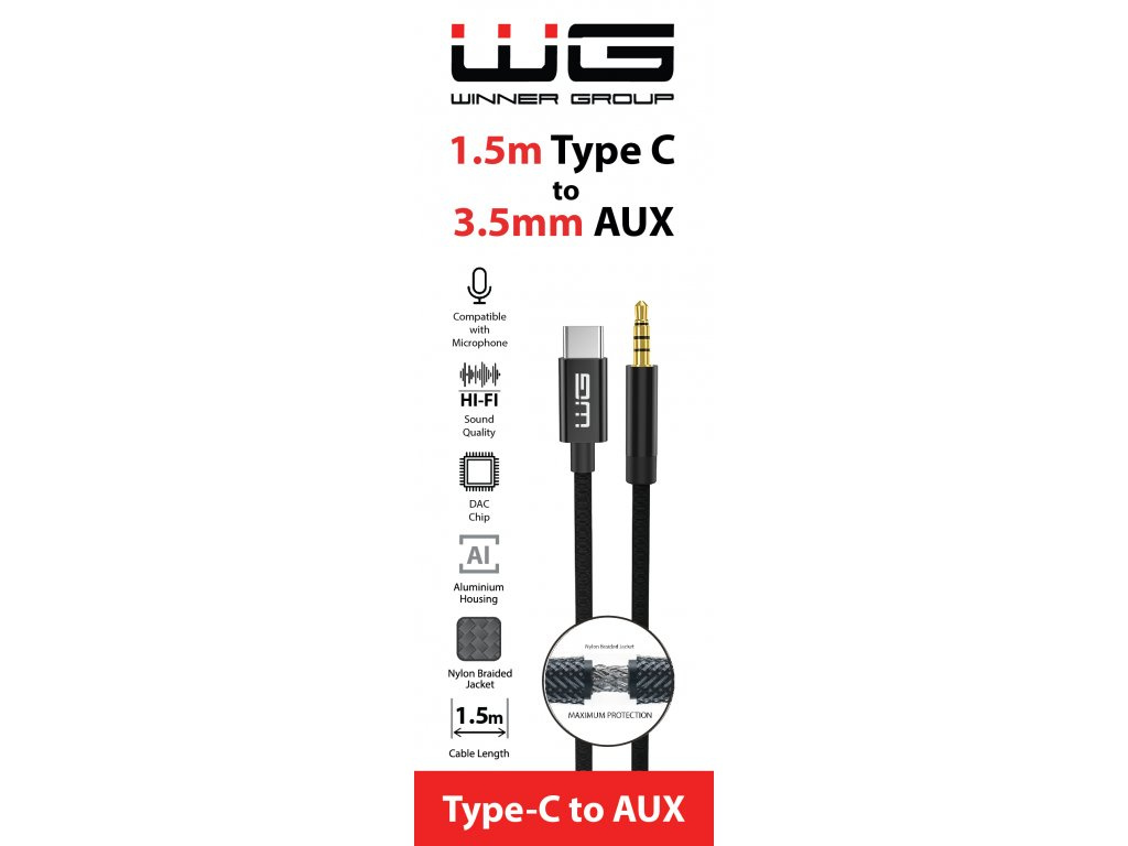 WG - Kabel Type-C (male) na AUX 3,5mm jack (male), 1,5metru, DAC chip, černáSpecifikace kabelu / redukce:USB-C, Jack / Cinch; Input:USB-C.