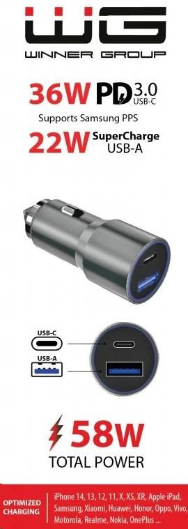 WG - Nabíječka do auta 2x USB 58,5W , 1x USB-C PD 36W + 1x USB-A 22.5W, stříbrnáZařízení:Mobil; Druh příslušenství:Nabíječky.