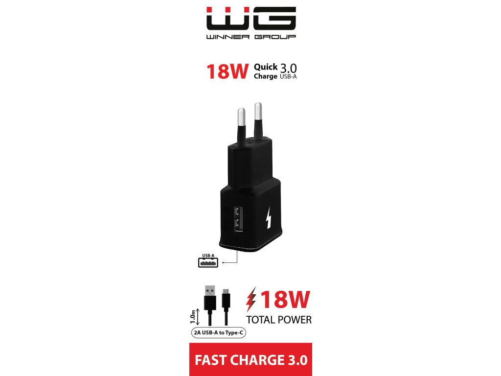 WG - Síťová nabíječka 1x USB-A, Quick Charge 3.0, 5V-9V-12V, + kabel USB-A na Type-C, černá