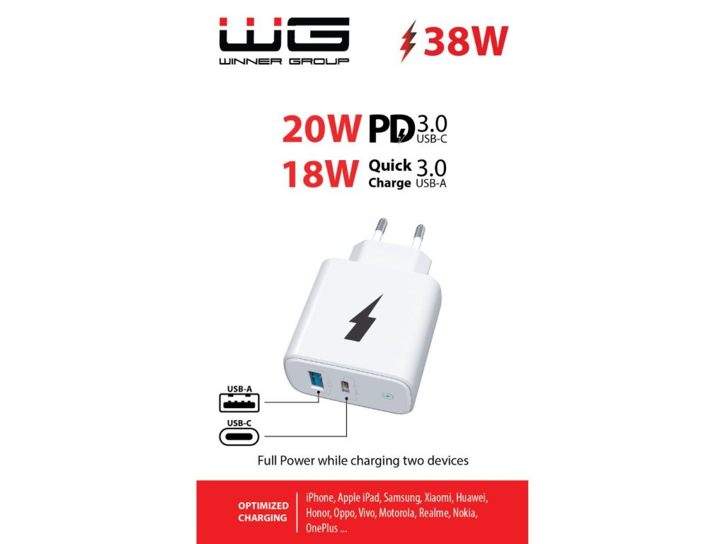 WG - Síťová nabíječka 2x USB 38W, 1x USB-C PD 20W + 1x USB-A QC 3.0 18W, bíláZařízení:Mobil, Tablet; Druh příslušenství:Nabíječky.