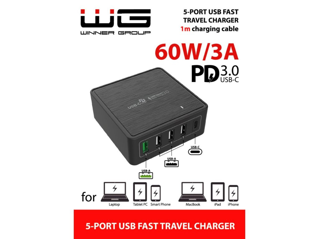 WG - Síťová nabíječka 5x USB 60W, 1x USB-A QC 3.0 + 3x USB-A Smart IC + 1x USB-C PD, černáZařízení:Mobil, Tablet; Druh příslušenství:Nabíječky.