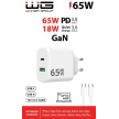 WG - Síťová nabíječka GaN 2x USB 65W, 1x USB-C PD 65W + 1x USB-A QC 3.0 18W, kabel Type-C na Type-C, bílá
