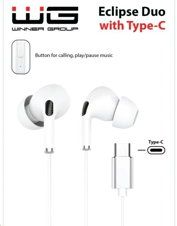WG - Sluchátka s konektorem Type-C, Eclipse Duo, drátové, whiteTyp sluchátek:Špunty; Konstrukce:Otevřené; Využití:Poslech hudby; Konektivita:USB-C; Mikrofon; Konstrukce mikrofonu:Integrovaný; Délka kabelu (m):1; Vedení kabelu:Oboustranné; Funkce:Ovládání hlasitosti; Způsob nabíjení:USB-C; Platforma:PC / mobil; Rozhraní sluchátek:USB-C; Vlastnosti sluchátek:Ovládání hlasitosti; Délka kabelu (m):do 1.5.