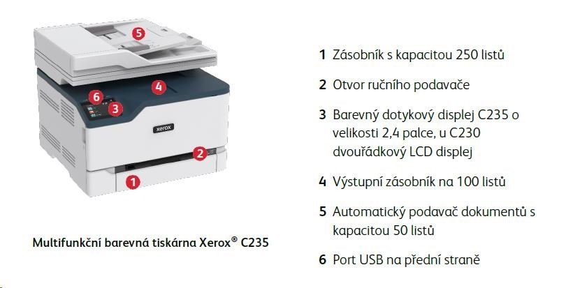 Xerox C235V je barevná laserová multifunkční tiskárna nabízející rozlišení tisku až 600 DPI. Rychlost tisku až 24 stran za minutu. Funkce skenování v rozlišení až 600 x 600 DPI a kopírování. Automatický oboustranný tisk. Podavač dokumetntů. Zásobník papíru na 250 listů. Možnost odesílat faxy. Přehledný LCD displej s tlačítky pro intuitivní ovládání. Nabízí připojení přes USB 2.0, Wi-Fi a konektor RJ45, podpora tisku z mobilních aplikací. Rozměry činí 411 x 344 x 394 mm, hmotnost 19,4 kg.