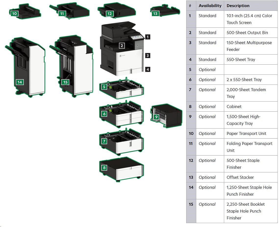 .Part Number 20L8200 Print Technology Color Laser Function Color Copying Color Faxing Color Printing Color Scanning Trusted Platform Module (TPM) The Trusted Platform Module (TPM) is not available in some countries. Workgroup Size Large Workgroup Touch Screen Display Yes Display Lexmark e-Task 10-inch (25 cm) class color touch screen Print Speed (Letter, Black) Up to 35 ppm4 Print Speed (Letter, Color) Up to 35 ppm4 Print Speed (Letter, Black) Duplex Up to 35 spm4 Print Speed (Letter, Color) Duplex Up to 35 spm4 Time to First Page (Black) As fast as 7.1 seconds Time to First Page (Color) As fast as 8.2 seconds Duplex (2-sided) Printing Integrated Duplex Print Resolution, Black 1200 x 1200 dpi 4800 Color Quality Print Resolution, Color 1200 x 1200 dpi 4800 Color Quality Copy Speed (Letter, Black) Up to 35 cpm4 Copy Speed (Letter, Color) Up to 35 cpm4 Copy Speed (Letter, Black) Duplex Up to 35 spm4 Copy Speed (Letter, Color) Duplex Up to 35 spm4 Time to First Copy (Black) As fast as 8.5 seconds Time to First Copy (Color) As fast as 9.5 seconds Reduce / Enlarge Range 25 - 400 % A4/Ltr Simplex Scan Speed (Black) Up to 120/120 sides per minute A4/Ltr Simplex Scan Speed (Color) Up to 120/120 sides per minute A4/Ltr Duplex Scan Speed (Black) Up to 240/240 sides per minute A4/Ltr Duplex Scan Speed (Color) Up to 240/240 sides per minute Scan Area, Maximum 11.69 x 17.0 inches ADF Scan DADF (single pass Duplex) Scanner Type Flatbed scanner with automatic document feeder Scan Resolution, Enhanced 600 x 600 dpi Scan Resolution, Optical 300 x 300 dpi Optical Scanning Resolution 300 X 300 dpi Scan File Formats (Send as) JPEG, JPG PDF Secure PDF TIFF Archival PDF (A-1a, A-1b) Searchable PDF TXT RTF DOCX Scan Destinations e-mail FTP USB Flash drive USB or Network connected computer Processor Speed Quad Core, 1.2 GHz Memory, Standard 4 GB Memory, Maximum 4 GB Hard Disk Intelligent Storage Drive included; Magnetic Hard Disk available Apple Operating Systems Supported Support is provided through AirPrint and AirScan only Citrix MetaFrame Microsoft Windows Server 2012 R2 Datacenter Edition running Citrix XenApp 7.5, 6, 7, 8, 9, 11, 12, 13, 14, 15, 16 Microsoft Windows Server 2012 Datacenter Edition running Citrix XenApp 7.5, 6, 7, 8, 9, 11, 12, 13, 14, 15, 16 Microsoft Windows Server 2012 Foundation running Citrix XenApp 6.0, 6.5 Microsoft Windows Server 2012 Essentials running Citrix XenApp 6.0, 6.5 Microsoft Windows Server 2012 Standard running Citrix XenApp 6.0, 6.5 Linux Operating Systems Supported Ubuntu 20.04 Debian 10 SUSE Linux Enterprise Server 12 SP5 OpenSUSE 15.2 Debian 11 Ubuntu 22.04 Fedora 36 Fedora 37 SUSE Linux Enterprise Server 15 SP4 OpenSUSE 15.4 Red Hat Linux 8.7 Red Hat Linux 9.1 Microsoft Windows Operating Systems Supported Windows Vista Windows Vista x64 Windows Server 2008 Windows Server 2008 x64 Windows Server 2008 running Terminal Services Windows Server 2008 x64 running Terminal Services Windows 7 Windows 7 x64 Windows Server 2008 R2 Windows Server 2008 R2 running Terminal Services Windows 8 Windows 8 x64 Windows Server 2012 Windows 8.1 Windows Server 2012 R2 Windows 10 Windows Server 2016 Windows Server 2019 Windows Server 2022 Windows 11 Novell Operating Systems Supported Novell NetWare 6.5 Open Enterprise Server Novell Open Enterprise Server 2 (SP3) on SuSE Linux Enterprise Server 10 SP4 (x86 and x64) 3 Novell Open Enterprise Server 11 (SP3) on SuSE Linux Enterprise Server 11 SP4 (x86 and x64) Novell Open Enterprise Server 11 (SP3) on SuSE Linux Enterprise Server 12 SP1 (x86 and x64) Novell Open Enterprise Server 15 (SP1) on SuSE Linux Enterprise Server 11 SP4 (x86 and x64) Other Operating Systems Supported Virtually any platform supporting TCP/IP Included Paper Handling 550-Sheet Tray 150-Sheet Multipurpose Feeder 500-Sheet Output Bin Optional Paper Handling 550-Sheet Tray Offset Stacker 500-Sheet Staple Offset Finisher 2 x 550-Sheet Tray 2000-Sheet Tandem Tray Cabinet 1,500-Sheet High-Capacity Tray Paper Transport Unit Folding Paper Transport Unit 1,250-Sheet Staple Hole Punch Finisher 2,250-Sheet Booklet Staple Hole Punch Finisher Paper Input Capacity, Standard Up to 700 pages 20 lb or 75 gsm bond Paper Input Capacity, Maximum Up to 4750 pages 20 lb or 75 gsm bond Paper Output Capacity, Standard Up to 500 pages 20 lb or 75 gsm bond Paper Output Capacity, Maximum Up to 2650 pages 20 lb or 75 gsm bond Paper Weight Range Supported - Standard Tray (lb.) 16 - 80 lb. Paper Weight Range Supported - Multipurpose Feeder (lb.) 16 - 80 lb. A3 / 11 x 17 Yes ADF 300-Sheet Automatic Document Feeder ADF Paper Input Capacity Up to 300 pages 20 lb or 75 gsm bond ADF Paper Output Capacity Up to 300 pages 20 lb or 75 gsm bond Finishing Option Yes Finishing Functions Offset stacking Stapling Hole punching Number of Paper Inputs, Standard 2 Number of Paper Inputs, Maximum 6 Media Types Supported Card Stock Envelopes Glossy Paper Labels Plain Paper Vinyl Labels Refer to the Paper & Specialty Media Guide Media Sizes Supported 10 Envelope 7 3/4 Envelope 9 Envelope A3 A4 A5 B5 Envelope C4 Envelope C5 Envelope DL Envelope Hagaki Card Executive Folio JIS-B4 JIS-B5 Ledger Legal Letter Statement Oficio A6 SRA3 Standard Ports USB 2.0 Specification Hi-Speed Certified (Type B) Gigabit Ethernet (10/100/1000) Front USB 2.0 Specification Hi-Speed Certified port (Type A) 802.11a/b/g/n/ac + Apple iBeacon Optional Local Ports Internal RS-232C serial Internal 1284-B Bidirectional Parallel Optional Network Ports MarkNet N8230 Fiber Ethernet Print Server Direct USB Yes Ethernet Network Yes Wireless Yes Wireless Network WPA2™ - Personal WPA™ and WPA2™ - Personal 802.1x Authentication: MD5, MSCHAPv2, LEAP, PEAP, TLS, TTLS Network Protocol Support TCP UDP IPSEC w/ IPv4 IPSEC w/ IPv6 ICMP IGMP IPv4 IPv6 Network Printing Methods Direct IP (Port 9100) Enhanced IP (Port 9400) FTP IPP 1.0, 1.1, 2.0 (Internet Printing Protocol) Microsoft Web Services WSD Pull Printing Thin Print LPR Network Management Protocols WINS AP