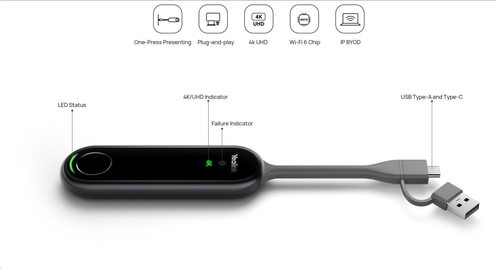 Yealink PA20 je nový 4K Ultra HD prezentační asistent. Díky hardwarovému streamování UHD až do 4K/30FPS šetří PA20 spoustu úsilí tím, že eliminuje nutnost instalace softwaru nebo ovladačů. Port USB typu A / plně vybavený port USB typu C je vhodný pro různé počítače a telefony. Protože PA20 má vestavěný software pro asistenta prezentací a čip Wi-Fi 6, jednoduše zapojte PA20 do zařízení a můžete být rychle připraveni prezentovat. PA20 vám poskytuje pohodlnější a bohatší zážitek ze sdílení obsahu.