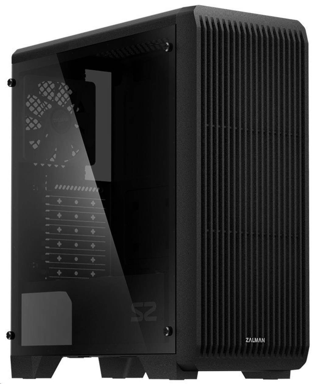 ZALMAN skříň S2 TG, ATX bez zdrojeProvedení skříně:Midi Tower; Barva skříně:Černá; Počet pozic 3.5" (HDD):2; Počet pozic 2.5" (SSD):2; Vybavení PC skříně:Bez integrovaného zdroje, Přední Audio panel, Přední USB panel, Průhledná bočnice.