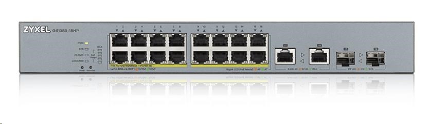 Zyxel GS1350-18HP 18 Port smart managed CCTV PoE switch, long range, 250W, 16x GbE, 2x combo RJ45/SFPProvedení:Rack mounted 19"; Funkce:Web management/Smart switch; Technologie:Gigabit Ethernet 1000Mbps; Počet portů LAN:24; Přenosová rychlost LAN (Mb/s):1000; Podporované standardy PoE:802.3af, 802.3at; Počet PoE Out portů:16; Počet portů Combo:2; Ventilátor; Přenosová rychlost LAN (Mb/s):0; Maximální počet portů:16; Management:Web.